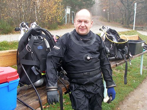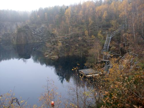 Lom je zahalen hustou mlhou a kromě Martina, který nás již očekává, nikde ani živáčka. Příprava, krátký briefing a jde se na to. Schodů k hladině je opět o trochu míň a průzračná voda už na první pohled slibuje zážitek. Signál palcem dolů zahajuje pohodový sestup. Skutečnost překonává očekávání. V odhadem desetimetrové viditelnosti míříme k domečku, proplaveme zárubní odkud již vidíme rám umístěný v nejhlubším místě lomu. Hloubkoměr v díře ukazuje 35.5 metru = zase o pár centimetrů víc! Teploměr, který na hladině naměřil příjemných 11 stupňů se jen nepatrně přikrčil k hodnotě 9 °C. Cítíme se fajn, míjíme několik místních atrakcí. Vůbec není kam spěchat, měníme tedy kurz do dlouhého zálivu v nejzazší části lomu. Doufáme, že se místní štiky zdržují právě tam. Na konci zálivu se pohání hejna okounů, ale po štikách jakoby se slehla "voda". Nevadí, otáčíme, abychom po zpáteční cestě prozkoumali ostatní zátoky. Bohužel ani tam se štičí rendez-vous nekoná, zato se můžeme pokochat báječnými pohledy. Potopené stromy mezi skalisky tvoří krásná zákoutí a pohlédneme-li k hladině z hloubky kolem 15 metrů, pak se stromy lemující břehy lomu mění v pohádkovou kulisu. Vznášíme se průzračným prostorem a vychutnáváme si nostalgickou atmosféru. Hodina utekla, vzduch nemilosrdně ubývá a je čas myslet na návrat. Vůbec se nám království klidu nechce opustit. Poslední kolečko v zátoce ve vstupní části lomu, 3 minuty bezpečnostní zastávky na schodech a palec vzhůru končí v 77 minutě báječný ponor. Sotva je automatika z úst, Jarda, který je na Horce poprvé, hýří superlativy. Je mi jasné, že brzy dáme repete...