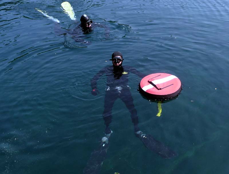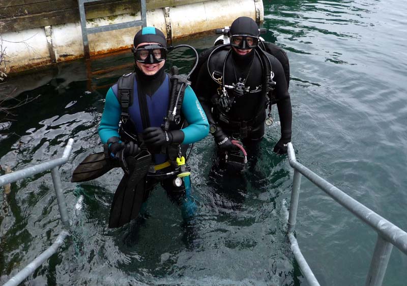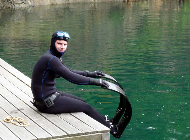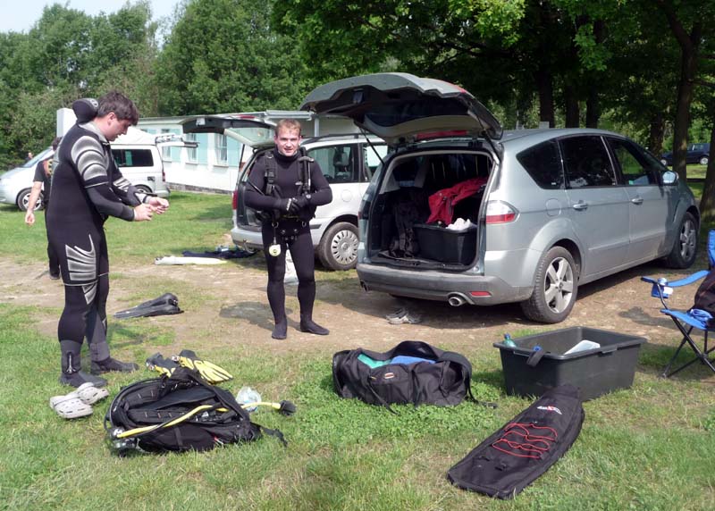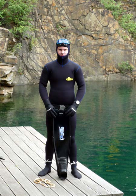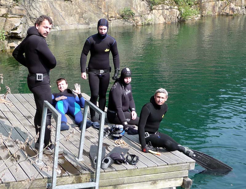 Postupně se sešla desítka Hastrmanů. První den měli navrch Freečkaři, kteří několikrát pokořili hloubku 30 metrů, a i ti, co na volné vodě teprve začínali, se v osobě Tondy Grimma nedali zahambit a kontrovali (i přes problémy s vyrovnáním) hloubkami kolem 16 metrů. Absolutní dno lomu navštívil i Sváťa se Zbyňkem - sice za pomoci složité dýchací aparatury, to ovšem nesnižuje jejich výkon, zejména z pohledu náročné termoregulace! Voda měla nahoře kolem 13 stupňů, a dole o trochu (hooodně) míň… nic moc, ale dvojitý neopren to jistil a hodina strávená na bojce byla tak akorát. Druhý den se karty otočily. Pavel s Boďou dokončovali kurz přístrojového potápění, Jirka prohnal svoje dvojče 2x15 l a zbytek se postaral o free – doprovod. Na Petru zbyla role foto-dokumentaristky a nezbytného maskota...