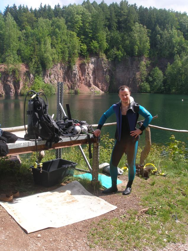 V neděli 23.5.2010 mne čekala premiéra: absolvoval jsem své první ponory kurzu CMAS P* na volné vodě. Rumchalpa je hastrmanům i hastrmankám notoricky známa, takže si každý dokáže představit jeho jedinečnou scenérii, navíc doplněnou pohledem na hejno kapříků vyhřívajících se u hladiny. Navzdory nepříliš optimistické předpovědi slunce pěkně hřálo, a tak není divu, že se to kapříkům líbilo. Voda byla bohužel rozkopána od jiných potápěčů a k nízké viditelnosti (kolem