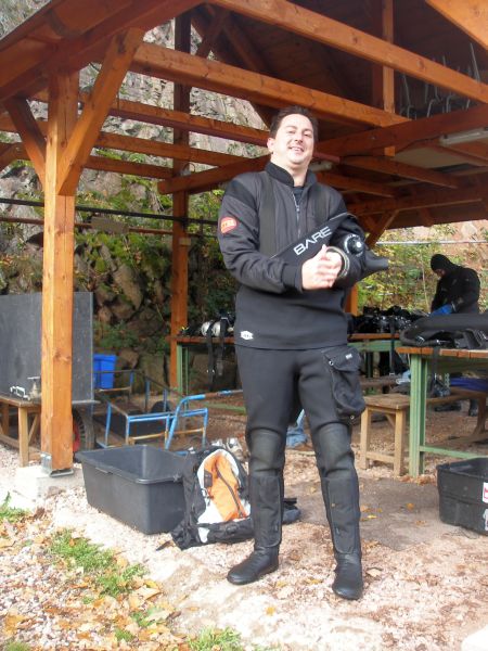 Pohodová Rumchalpa... Takový pocit jsem měl ze sobotního ponoru. Ranní mlha se rychle rozplynula a sluníčko zpříjemnilo strojení do neoprenů. To bylo veledůležité pro mého badíka Patrika, neb se chystal ponořit pouze v 5 mm overalu. Se sebevědomým výrazem ve tváři se zanořil a zaujal pozici v perfektním trimu. Obeplutí poloviny lomu nám zabralo necelých 20 minut. Okolí jachty nám trochu zakalili místní "tekkies" na skůtrech, ale jinak všude příjemná viditelnost v průměru 3 - 4 metry. Po sumcích se bohužel slehla zem, pardon - voda, a štiky evidentně nejevily zájem o blízké setkání. Situaci zachránil pěkný kapřík, který se na chvíli mihnul kolem nás. 30. minuta ponoru a Patrik stále signalizuje že mu není zima, přestože voda má jen (nebo ještě?) 12 °C. Vyzkouším tedy míru jeho chrabrosti. Zanořujeme se k platu ve 12 m. Viditelnost klesá asi na 30 cm, teploměr ukazuje 10 °C, takže není čím se kochat a nač čekat. Palec vzhůru a jde se za světlem. Teprve po 50 minutách se konečně hlásí zima a Patrik souhlasí s ukončením ponoru. Vzorový výstup rychlostí 1 m za minutu a ocitáme se na sluncem prozářené hladině...