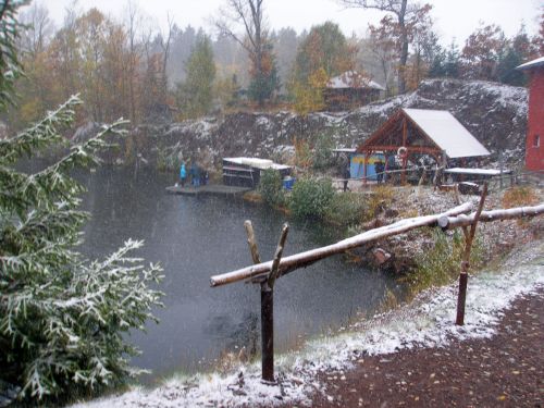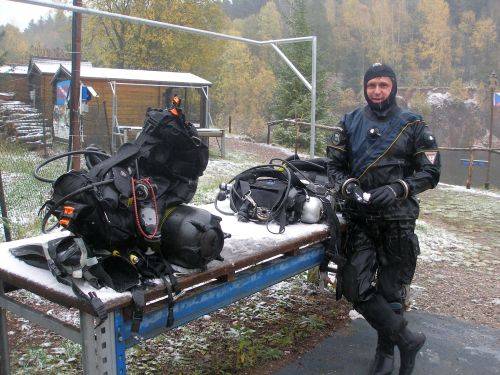 Čerti se dnes na Rumchalpě doslova "ženili". Přivítal nás silný vítr a ledová sprška mokrého sněhu a teplota na nule... Patrik se opět nasoukal do letního 5 mm overalu s tím, že voda je přece ještě "teplá". Slávek na tom byl líp: jeho dvoudílný neopren byl o několik milimetrů silnější. Jenom já jsem v sucháči nemusel otázku tepelného komfortu řešit. Vydali jsme se na standardní kolečko kolem lomu. Oproti minulé návštěvě klesla teplota o 2 stupínky na 10°C. Viditelnost opět kolísala od nuly (zákal od hloubky 11 metrů) do místy až 5 metrů! Štiky se mám tentokrát nevyhýbaly, jen kapr, kterého jsem načapali v zadní části lomu rychle mizel za hranici viditelnosti. Na mělčinách kolem jachty a za ní lomu panovala zvláštně ospalá atmosféra, i jinak aktivní okouni se zdáli o poznání línější. Míjíme další atrakce, blížíme se k třímetrovému platu... najednou se před námi zdvihne stěna kalu. Nejmenovaná škola zde i za těchto podmínek dokončuje ponory s kurzisty, kteří v snaze o přežití deptají dno údery ploutví a mávají rukama kolem sebe jako při zahřívací rozcvičce... Patrik hlásí rezervu, na komputeru naskočila 55.minuta, je čas na ukončení ponoru. Mokrá část hastrmanní trojice oceňuje komfort použití převlékárny. Tradiční zastávka v bistru Na Kumburáku se skvělou zelňačkou. A závěr? Dnešní ponor na Rumchalpě určitě nebyl v letošním roce posledním.
